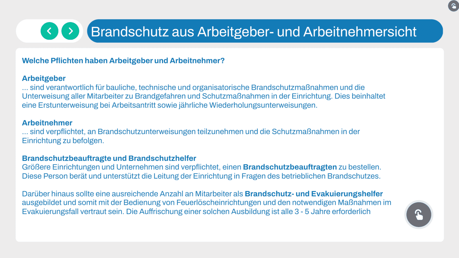 Brandschutz geht uns alle an. Er ist ein wesentlicher Pfeiler für die Sicherheit und den Gesundheitsschutz an unserem Arbeitsplatz. In diesem kompakten Kurs vermitteln wir Ihnen das nötige Wissen, um im Ernstfall ruhig und sicher zu handeln.
